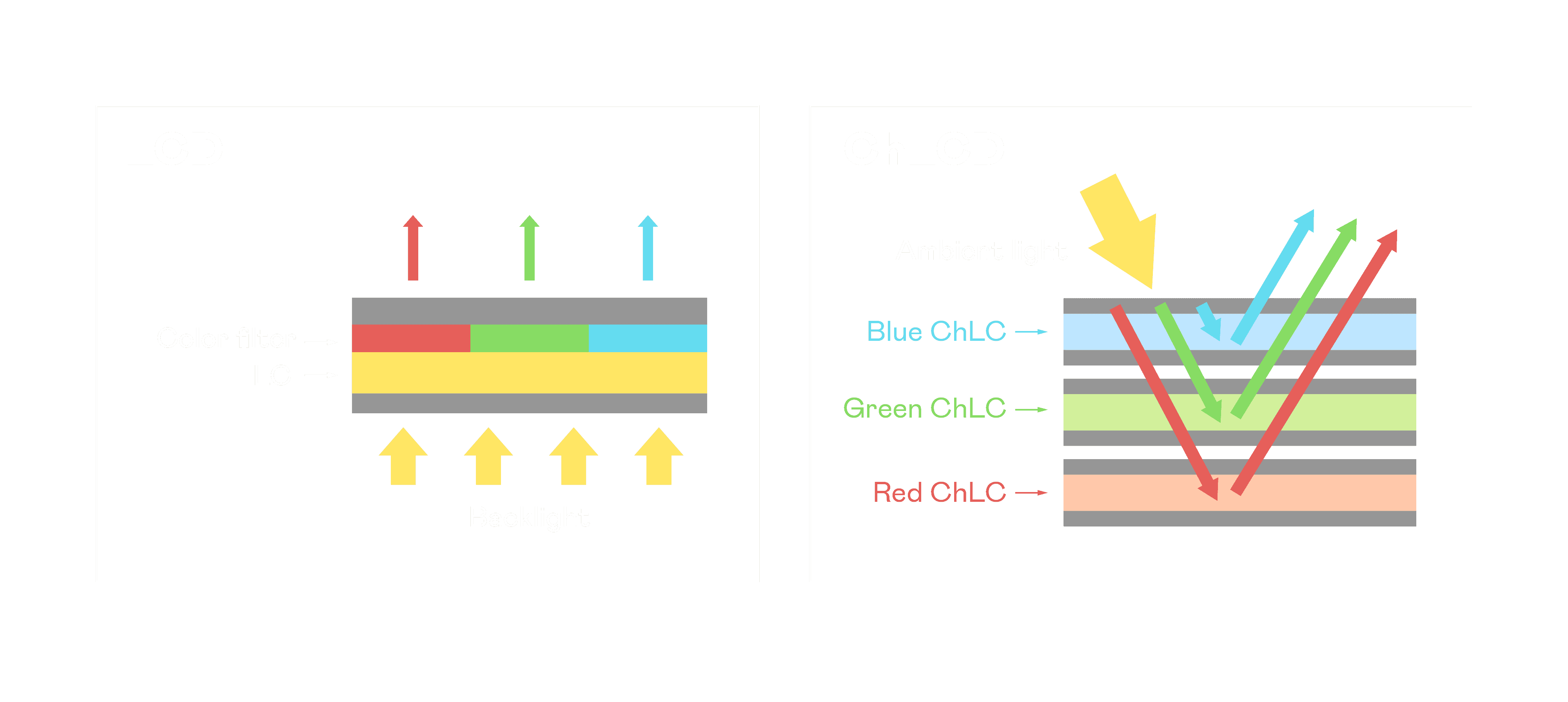 ChLCD 胆固醇液晶就如同纸张一样,,,透过反射环境光来显示影像,,,,因此长时间观看不易造成人眼视觉疲劳,,,可达到护眼效果。。当处于户外阳光下使用,,,LCD 影像容易失真而不易观看,,,,但胆固醇液晶仍可维持较佳的影像品质。。。。
