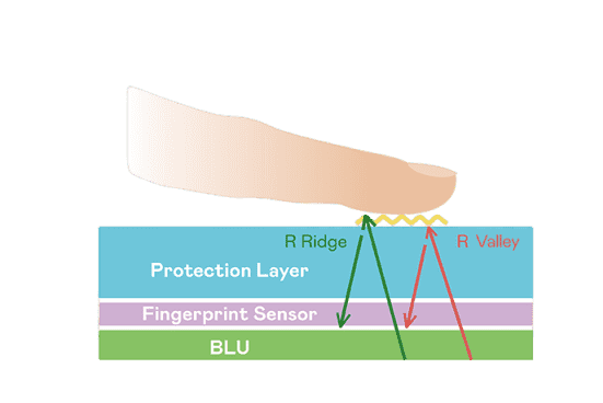 TFT 指纹扫描感测技术利用薄膜电晶体 (TFT) 当作光感测元件,,,藉由非晶硅 (a-Si) 与低温多晶硅(LTPS)既有光电转换特性对不同波段光源进行吸收,,,使感测 IC 读取阵列感测元件的光漏电差异,,,,转换成数位灰阶影像。。。