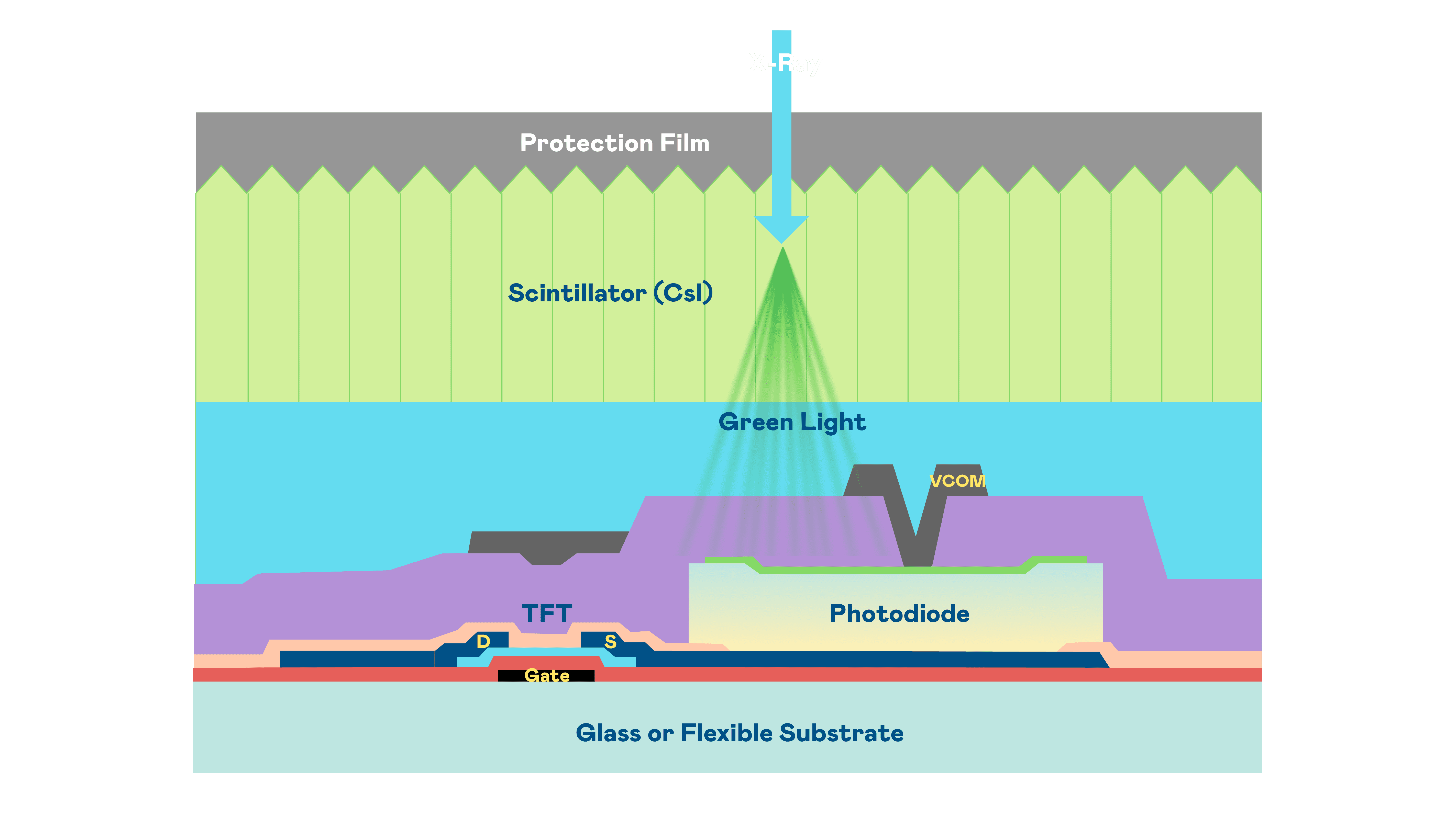 Wepay的X光影像感测阵列使用薄膜电晶体 (TFT) 作为每个像素的读取开关,,搭配光电二极体(Photodiode)的光电转换元件,,,用以感测X光影像讯号。。。